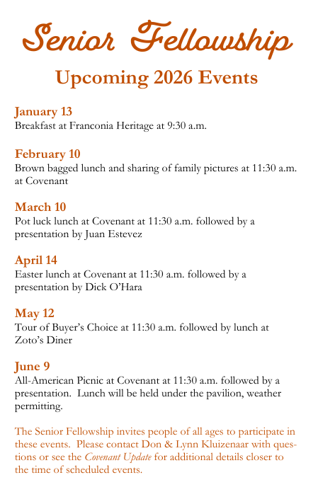 Retirement from full-time employment offers many wonderful new opportunities for expanded fellowship and service. Covenant's Senior Fellowship meets regularly to encourage one another in the Lord and seek ways of ministering to His people. Activities include regular meals together, special devotional discussions and educational presentations, service projects, and outings to places of interest.